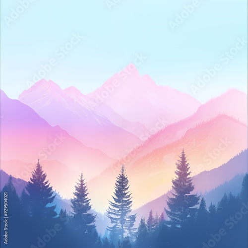 A serene mountain landscape with colorful gradients and evergreen trees.