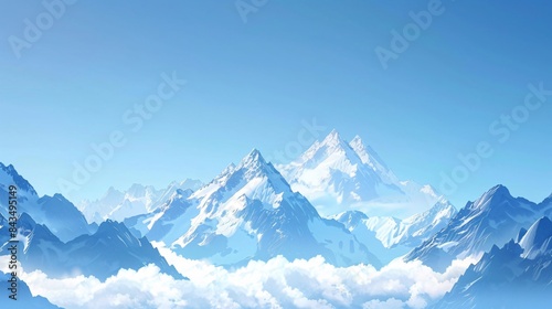A serene mountain landscape with snowy peaks and a clear blue sky, providing a spacious background for text placement, Generative AI