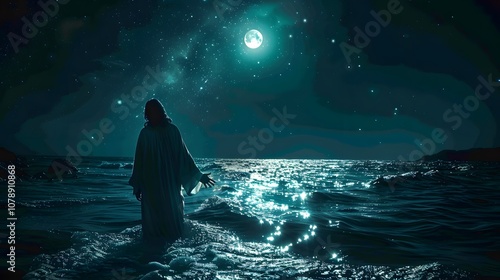 A serene night scene of Jesus on a moonlit ocean, hand extended towards the viewer, warm and inviting, gentle ripples around him, glowing under a starlit sky,