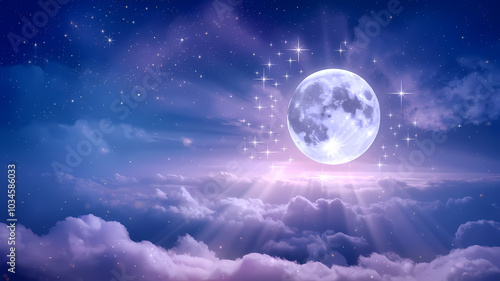 A serene night sky featuring a bright full moon surrounded by sparkling stars and soft, fluffy clouds.