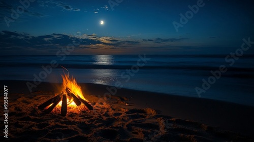 A serene nighttime beach scene featuring a bright, crackling campfire on the sands with the moon shining over a calm ocean, creating a peaceful ambiance.