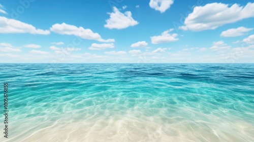 A serene ocean view with clear turquoise water and fluffy clouds under a bright blue sky, perfect for relaxation and tranquility.