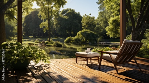 A serene outdoor workspace with a wooden deck, lounge chairs, and a view of lush greenery, offering a refreshing change of scenery for brainstorming and creative thinking. Minimal and Simple,