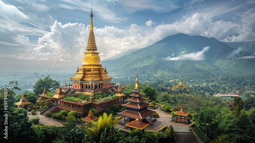 A serene panorama of a golden temple surrounded by the peaceful beauty of Thailand's landscape, the tranquil atmosphere and stunning architecture inviting viewers to explore the country's rich