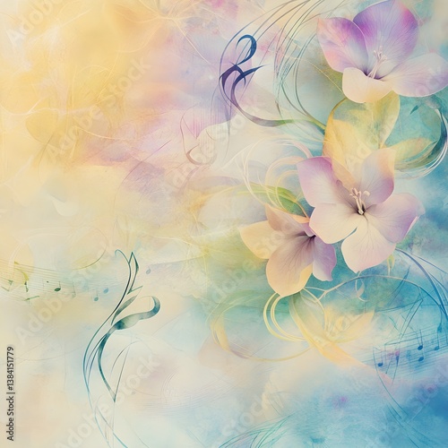 A serene, pastel abstract artwork featuring delicate flowers intertwined with musical notes, creating a harmonious, dreamy atmosphere.