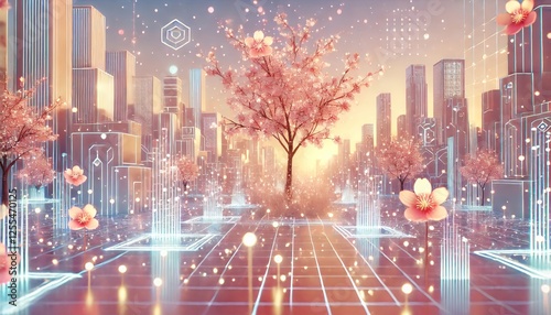 A serene pastel-colored illustration of a futuristic cityscape adorned with blooming cherry blossoms, glowing LED petals, and holographic sky effects