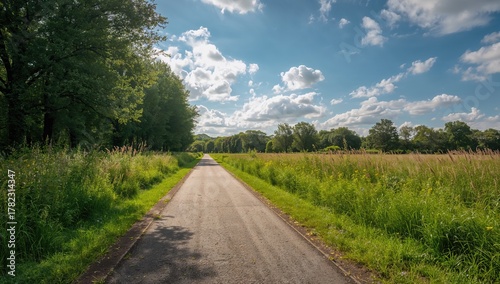 A serene pathway surrounded by vibrant green grass, ideal for a calming walk, seasonal change