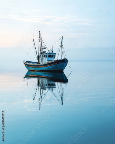 A serene photo of a fishing boat anchored near a quiet coastline, with the reflection shimmering in calm waters