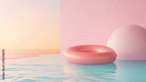 A Serene Pink Lifebuoy Floating in a Beautifully Tranquil Aquatic Scene of Nature