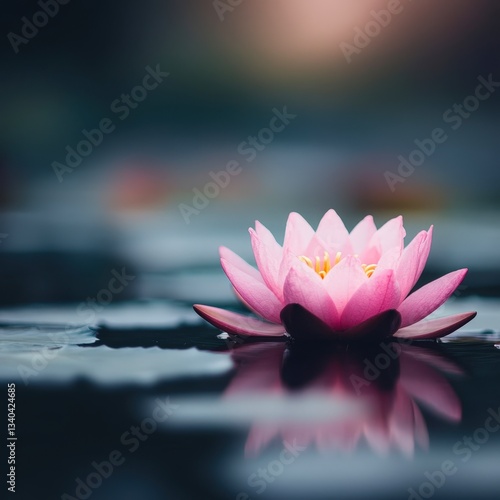 A serene pink lotus flower floats gracefully on dark water, reflecting its beauty and creating a tranquil scene, Ideal for wellness, meditation, or nature-themed projects,