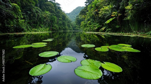A serene pond with water lilies floating on the surface, surrounded by dense greenery
