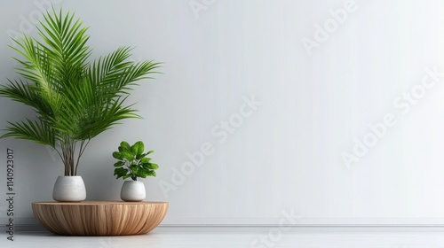 A serene scene featuring two green plants in white pots on a circular wooden stand, set against a pale backdrop to highlight minimalist decor style.
