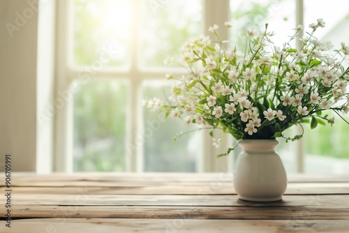 A serene scene featuring white flowers in a vase placed on a wooden table with a sunlit window in the background.