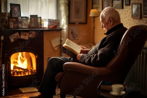 A serene scene of an elderly man reading a book by the warm fire. This cozy moment captures comfort and relaxation. Perfect for home ambiance and nostalgia. Generative AI
