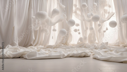A Serene Scene of Floating White Fabrics Evoking Tranquility and Purity
