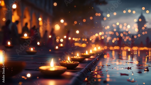 A serene scene with glowing lamps floating on water, creating a magical atmosphere during a celebration at dusk.