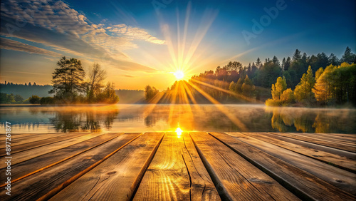 A serene sunrise bathes a misty lake in golden light, highlighting the shore and trees. A wooden dock extends into the water, offering a peaceful spot to savor the early morning calm
