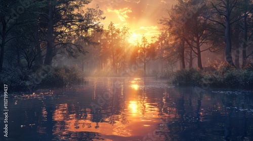 A serene sunset over a tranquil river, surrounded by trees and mist.