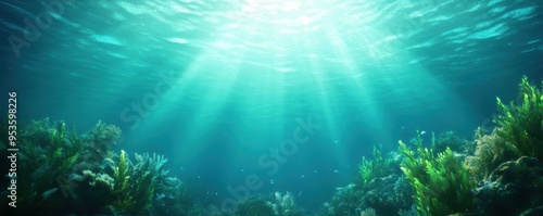 A serene underwater scene showcasing vibrant plants illuminated by soft sunlight rays penetrating the crystal-clear water.