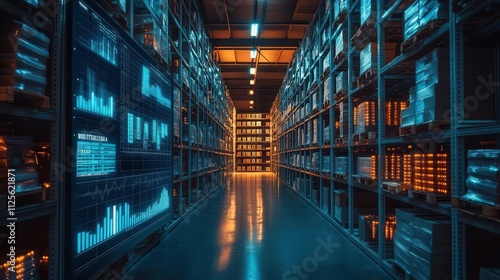 A serene warehouse environment where efficiency graphs glow softly on screens, surrounded by shelves of inventory, warm tones