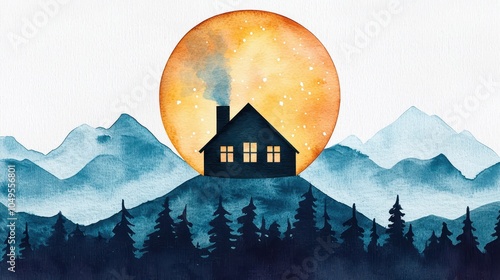 A serene watercolor scene depicting a house silhouette against a vibrant sunset, surrounded by mountains and forest, conveying tranquility and nature's beauty.