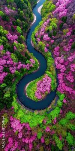 A serene, winding river flows through a vibrant forest of pink and green foliage, showcasing the beauty of nature in full bloom.