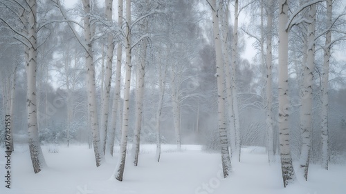 A serene winter forest scene with snowcovered birch trees and a soft, misty atmosphere