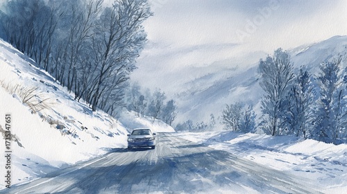 A serene winter landscape featuring a snow-covered road flanked by bare trees, creating a tranquil atmosphere.