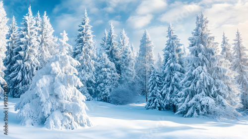 A serene winter landscape featuring snow covered evergreen trees under bright blue sky. tranquil scene evokes sense of peace and beauty in nature