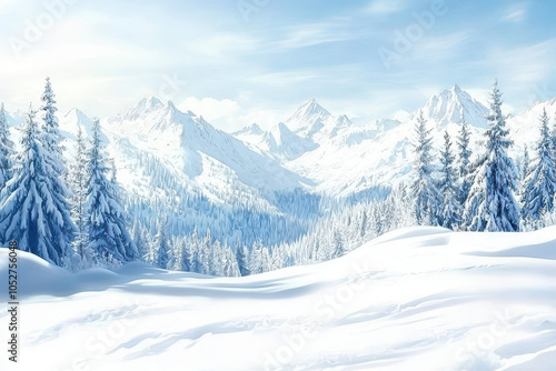 A serene winter landscape featuring snow-covered mountains and evergreen trees under a clear blue sky.