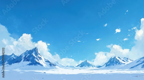 A serene winter landscape featuring snow-covered mountains under a clear blue sky.