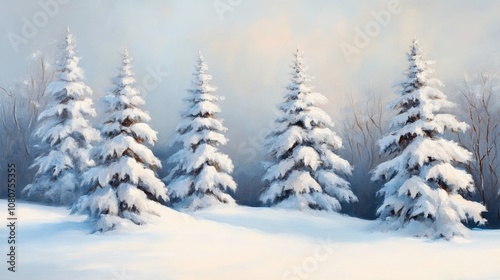 A serene winter landscape featuring snow-covered pine trees under a soft, muted sky, evoking a peaceful and tranquil atmosphere.