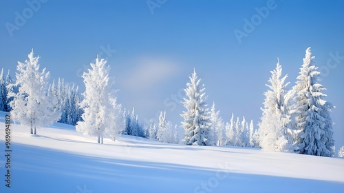 A serene winter landscape featuring snow-covered trees and a clear blue sky, perfect for a calming backdrop