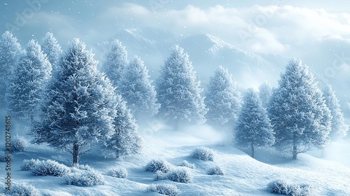 A serene winter landscape featuring snow-covered trees and distant mountains under a cloudy sky.