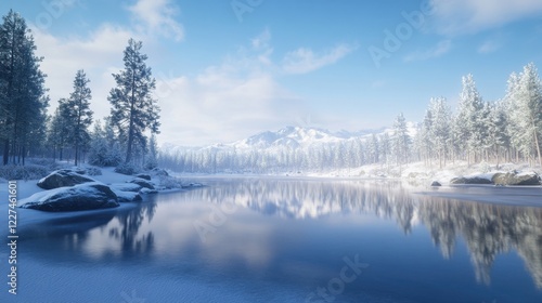 A serene winter landscape with snow-covered trees and a reflective lake under a bright sky.