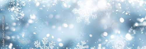 A serene winter scene with delicate snowflakes falling against a soft blue backdrop. Bokeh lights create a warm and festive atmosphere, symbolizing peace, joy, and the magic of the season.