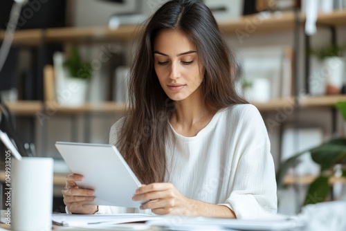 A serene woman with long brown hair reads a tablet in a light-filled home office, capturing the essence of focus, modernity, and calm productivity.