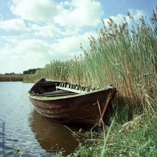 A serene wooden boat rests peacefully by a tranquil reed-lined riverbank