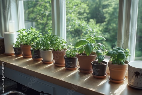 A series of potted herbs line a sunlit windowsill, creating a lush and vibrant indoor garden against a backdrop of greenery.