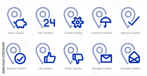A set of 10 micro icons as bank location, 24x7 location, location setting