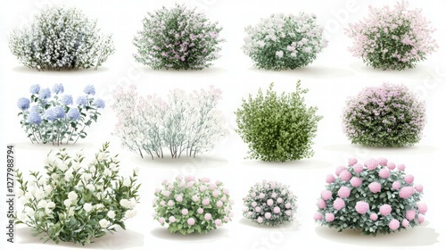 A set of bushes with flowers in different shapes. A set of different types and sizes of bushes with flowers, greenery on a white background