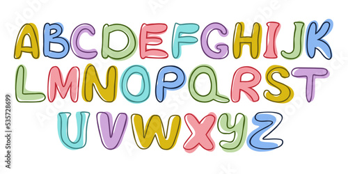 A set of cartoons in the English alphabet for a child. ABC. Translation: Letters of the alphabet from A to Z. Doodle hand drawn. Design for typography, banners, cards and more. Flat vector style.
