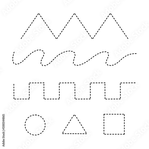A set of geometric shapes drawn with dashed lines, including a square, circle, triangle, and steps, representing basic design elements and structure.
