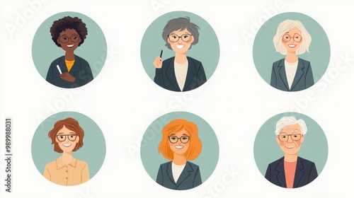 a set of illustrated avatars of teachers in circular frames, each reflecting different teaching styles and personalities. One teacher wears a blazer and holds a pointer, another wears glasses