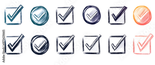 A set of modern illustration symbols that represent check boxes, exam marks, and checklist marks. Sketches of check signs, voting agreement checklist marks, and examination tasks.