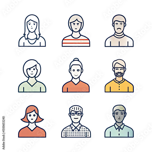 A set of nine unique human avatar icons showcases different hairstyles and expressions representing a diverse range of characters in a creative format