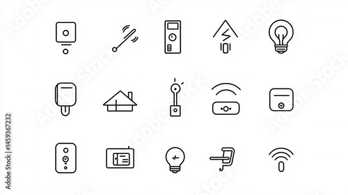 A set of various icons representing different types of electronic devices equipment and technology related elements such as plugs switches lights and interfaces
