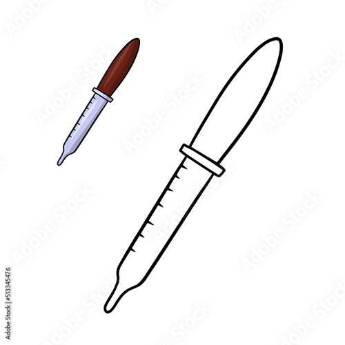 A set with a monochrome picture, a glass pipette with a rubber filler, a vector illustration in a cartoon style