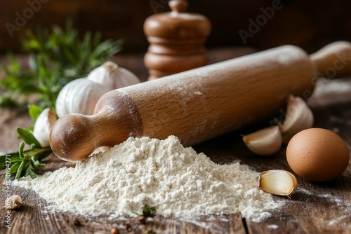 A setup with a rolling pin, culinary utensils, and dough ingredients against a wooden surface