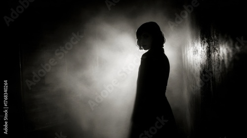 A shadowy figure stands still in a foggy corridor creating an atmosphere of mystery and suspense.